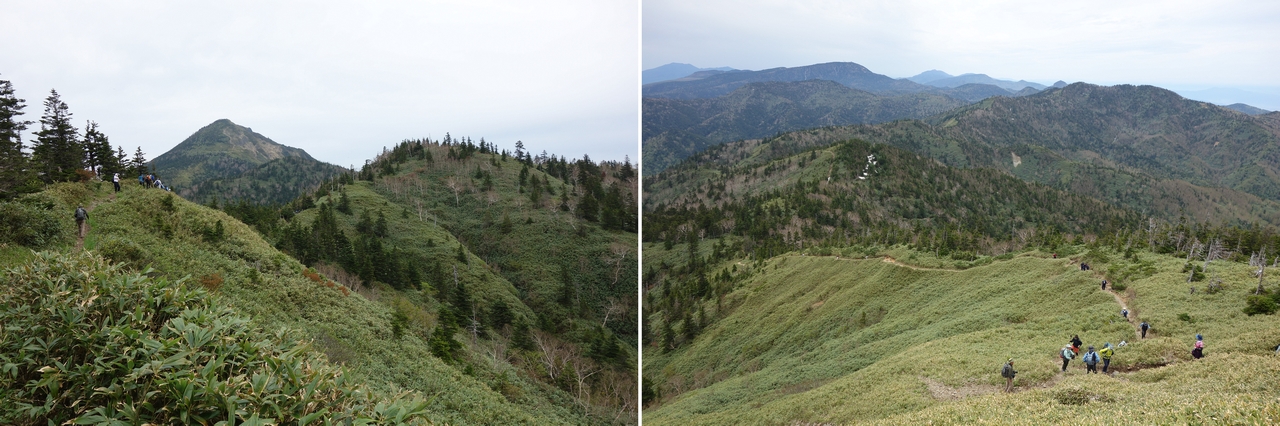 右:岩菅山山頂近くから南方向(歩いてきた方向)を撮影。尾根に沿って線のように見えるのが歩道。奥には浅間山、草津白根山、横手山、四阿山などが見られます。右手前が寺小屋峰。