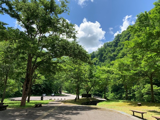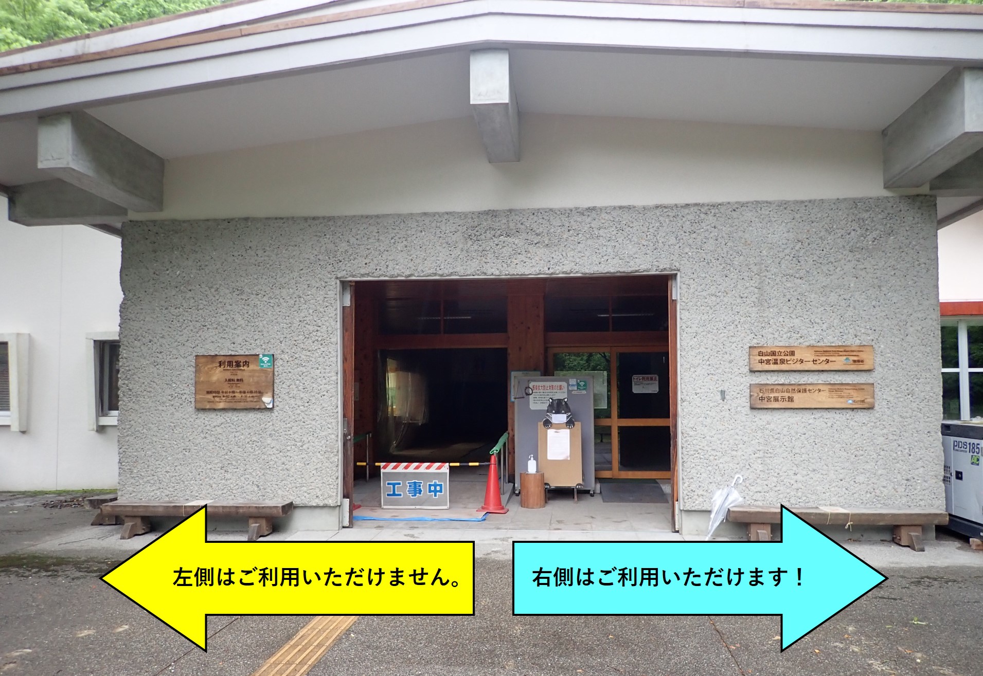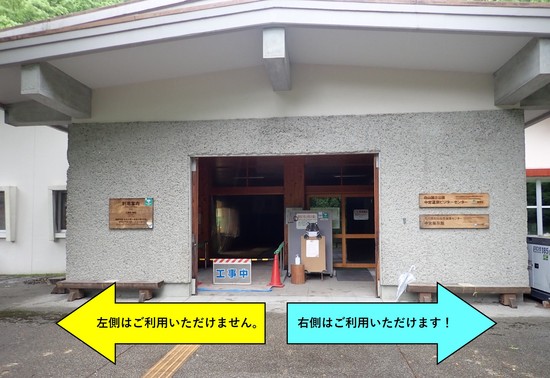 石川緊急事態宣言が出ている間に季節は進み、市ノ瀬(標高830m)や中宮(標高600m)など、ビジターセンターがある辺りは木々の緑がすっかり濃くなっています。  (中宮ビジターセンター・中宮展示館前。6月15日撮影) 標高が低い町中は気温が高く、蒸し暑いというニュースを耳にするようになっていますが、このあたりはまだまだ涼しく爽やかです。 ■ 中宮温泉ビジターセンター内のトイレ工事 中宮温泉ビジターセンター(中宮展示館)も6月14日(月)から今年の開館が始まりましたが、現在、トイレの改修工事を行っています。