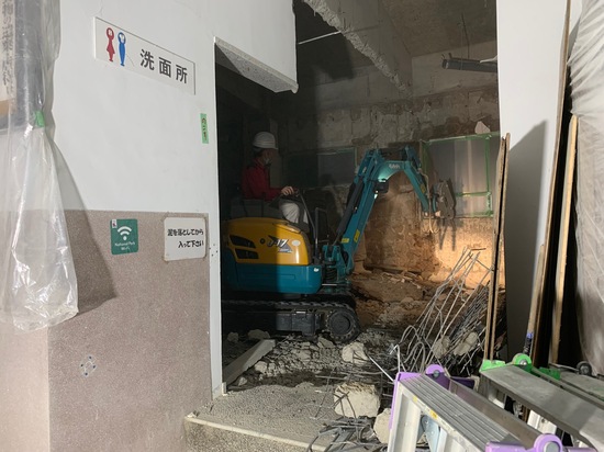 (解体工事の様子) 6月末頃までは古い設備の解体工事で、廃材の搬出を行うことがあります。 このため、6月末頃までの平日は、正面入り口から左側の展示エリア(白山の地質や化石、高山植物、中宮散策に関する展示)に入ることができません。