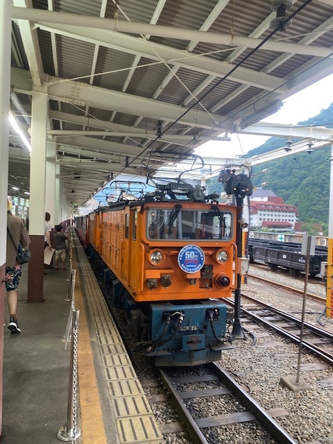 <今年は黒部峡谷鉄道開業50周年。今年限定のヘッドマークが付いています。>