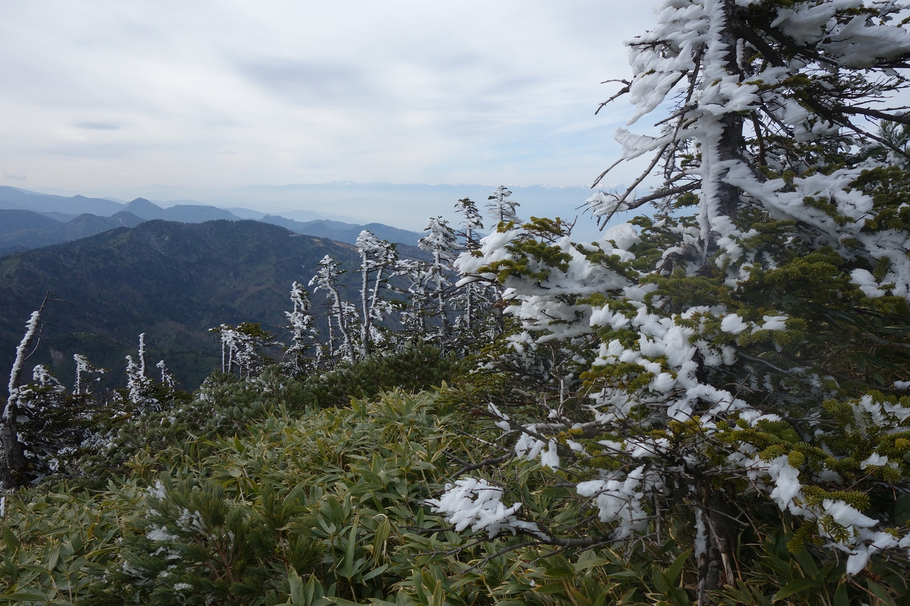 この岩菅山のエビのしっぽがさらに成長するかどうかは天候次第です。この日は太陽が見え隠れする天気で、歩いていると氷が落ちる音がしていました。