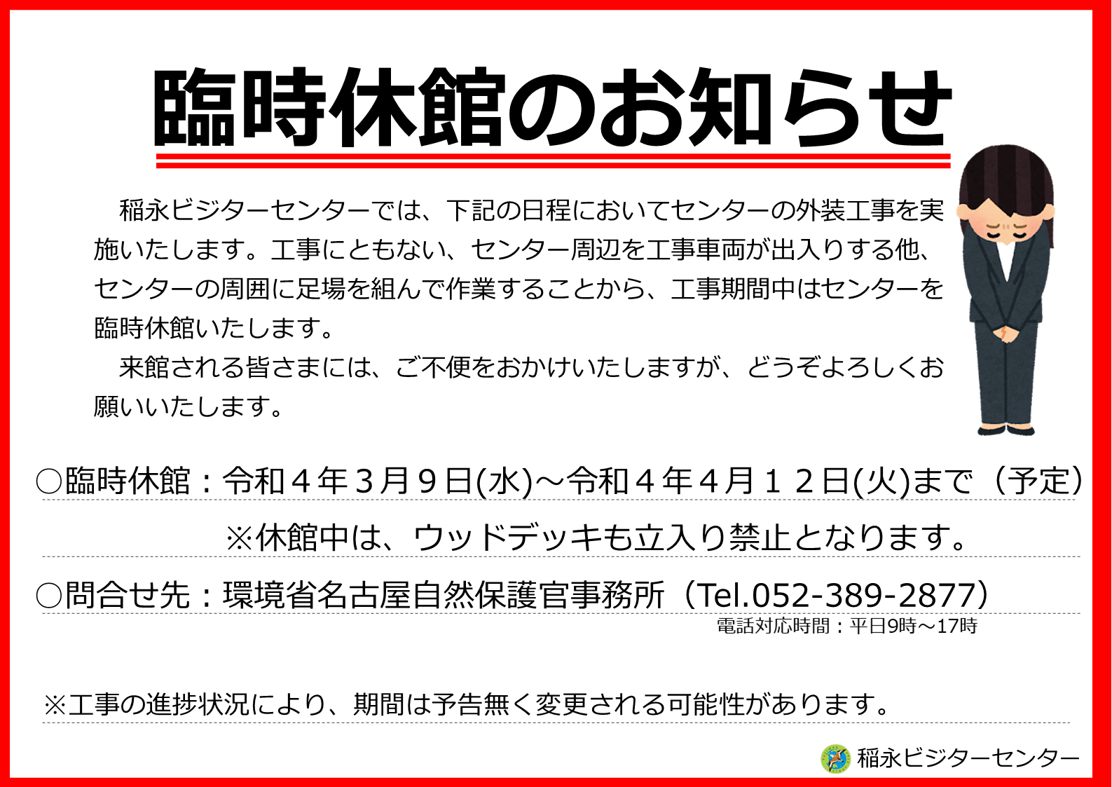 現在臨時休館中の稲永ビジターセンターにつきまして、工事の進捗状況により、臨時休館が下記の期間まで延長となりましたことをお知らせいたします。