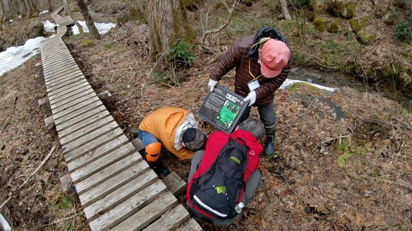 (看板設置中! パークボランティア撮影) 冬期通行止め解除がいつになるか読めませんが、開通する時には施設を再開させたいので、現在、作業中です! ちなみに、石川県道白山公園線の通行止め区間から市ノ瀬までの道中にある根倉谷園地のミズバショウはすでに咲き始めています。
