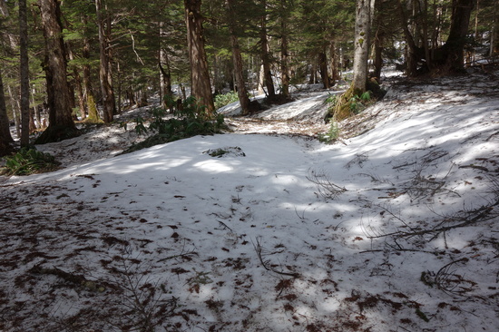 <積雪があるので慣れていないと進行方向を見つけづらいです。雪が白いのは前日5月9日に雪が降ったため。この場所の標高は約1,850m。道は北向き斜面の中腹にあり、植生は常緑の針葉樹が主なので、日影が多いです。>