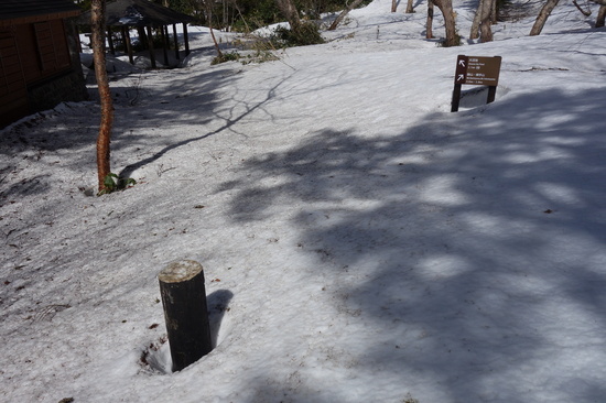 <残雪の深さの目安。手前の円柱は地上の高さが150cmくらいの誘導標識で、30cmほどが雪の上に出ています。奥の誘導標識も地上の高さが150cmくらいで、半分ほどが雪の上に出ています。左の雪囲いのある建物が四十八池公衆便所です。>