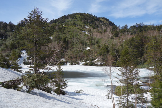 <四十八池湿原の西側にある「元池」。奥に見えるのは裏志賀山。火山活動によってできたと言われています。雪のある時期には近くまで行けます。>