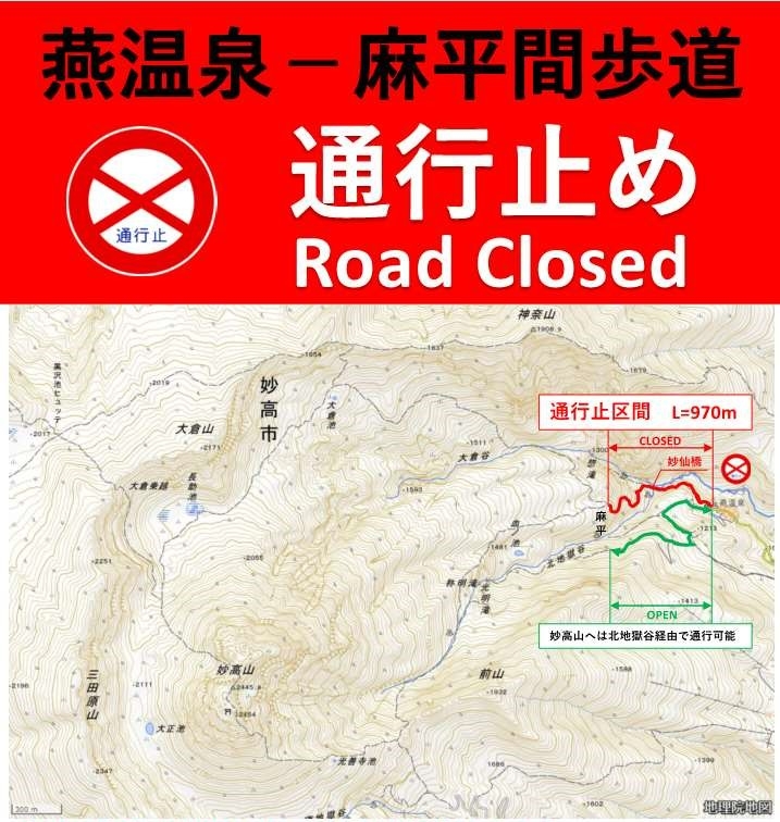 崩落の危険があるため、妙高山登山道の一部、燕温泉-麻平区間を当面の間、通行禁止とします。