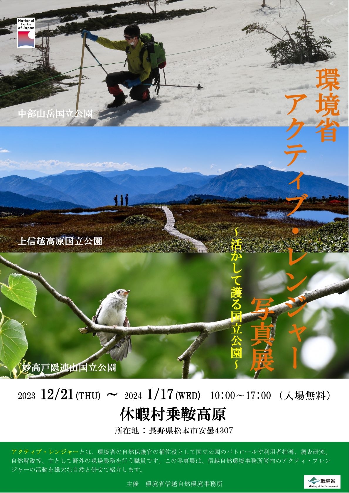 中部地方環境事務所のアクティブ・レンジャーが、活動の様子をお伝えします。アクティブ・レンジャーとは、自然保護官の補佐役として、国立公園等のパトロール、調査、利用者指導、自然解説などの業務を担う環境省の職員です。管内には、上信越高原、妙高戸隠連山、中部山岳、白山、伊勢志摩国立公園があります。