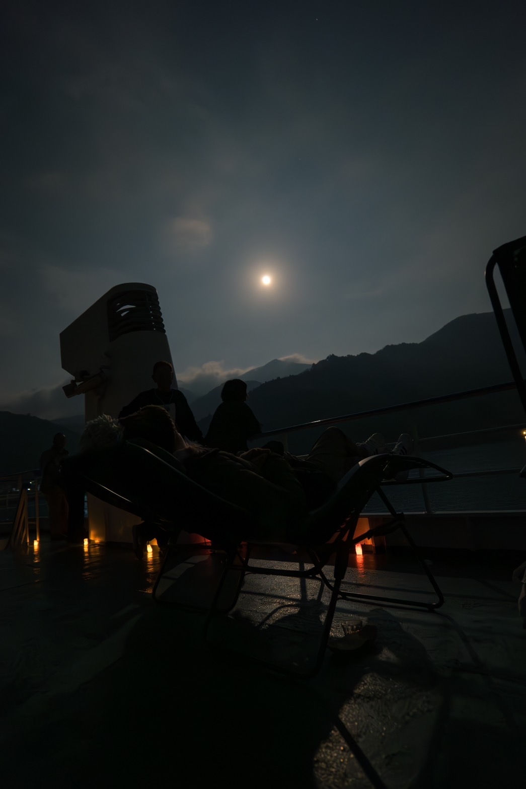 夕暮れに浮かぶ神社を堪能した後は、夜の湖をクルージング。あいにくの曇りでしたが、雲の間から満月を翌日に控え、丸く光る月が顔を出すと、湖面は一気に明るくなりました。