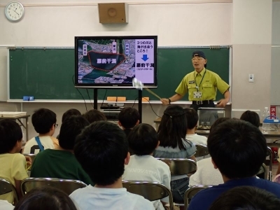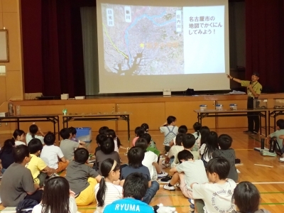 みんなが揃ったら出前講座の始まりです。元気よく挨拶してスタートです。スライドに注目してくれるように、クイズや質問コーナーを織り交ぜて藤前干潟を紹介していきます。暑いと眠くなりがちですが、レンジャー劇場でみんなを笑わせたりして盛り上げながら進めます。