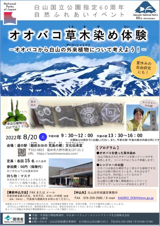 この夏、白山自然保護官事務所は、白山国立公園指定60周年を記念して、オオバコ草木染めイベントを実施します!