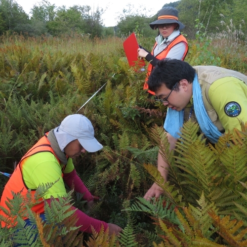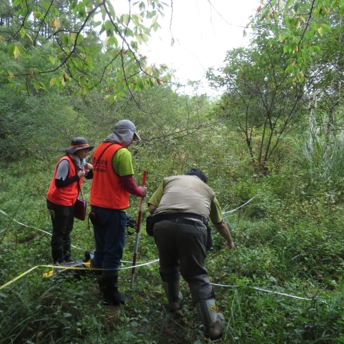 シカの居そうなエリア内に10m×10mのコドラート(四角で区切った範囲)を設定し、その範囲内に生えている草木を一本一本丹念に見て、食害の有無を記録していきます。根気の要る地道な作業のため、一地点の調査をするのに一時間半もかかります!