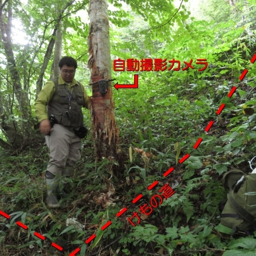 カメラは、周囲の地形や食痕、獣道等の様子から「ここは居そうだな?」というところにアタリを付け、適当な樹木に設置します。現在、高原内で十数台のカメラを運用中です。