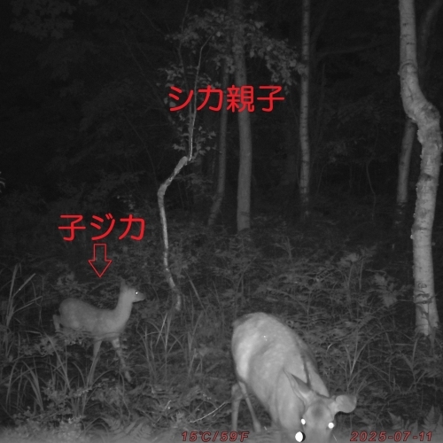 設置は6月から行っているのですが、①の食痕調査以上に衝撃的だったのがこのデータの中身です。継続的に、かなりの頭数のシカが行き来し、採食する様子が写っていました。特に注目したいのは親子のシカが写っていたことで、シカ専門員によると、これは乗鞍高原内で繁殖をしているサインとのこと。すでに分布拡大初期を過ぎ、増加相と呼ばれるフェーズに入っている模様です。