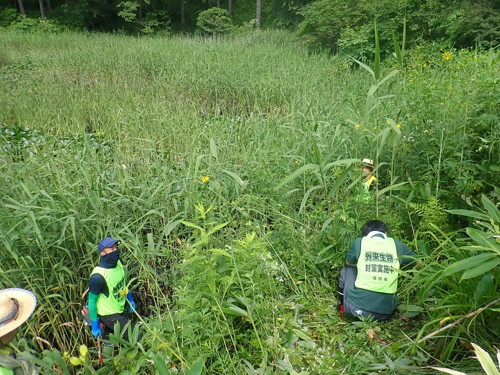 7月28日、草津町西の河原公園で、白根山系の高山植物を護る会主催の外来種駆除作業ボランティアに参加しました。吾妻森林管理署、草津町役場、株式会社草津観光公社、グリーンサポートスタッフ、あるこう会、草津の自然を愛する会、当所の総勢16名での作業となりました。