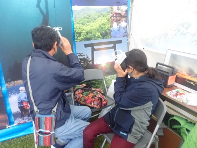 VR体験では伊勢志摩国立公園の森や海、町などの風景を見ることができます。空中からドローンで撮影したものがVRゴーグルで流れるので、体験中はまるで空を飛んでいるような気分を味わえますよ。特に当日は一日天候が悪く、きれいな景色が見られない日だったのでVR体験大活躍でした。