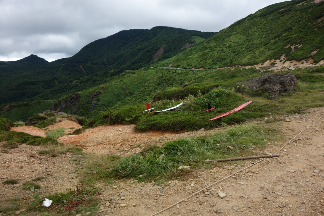・写真中央のグライダーの下敷きになっている植物は主にガンコウランです。ガンコウランは指定植物(高山植物その他の植物で環境大臣が指定するもの)です。特別地域では、指定植物を採取することと、損傷することは規制されています。グライダーを置いたり持ち上げたりする際にガンコウランを損傷するおそれがあります。万が一を避けるため、グライダーは地面など植生のない場所に置いてください。