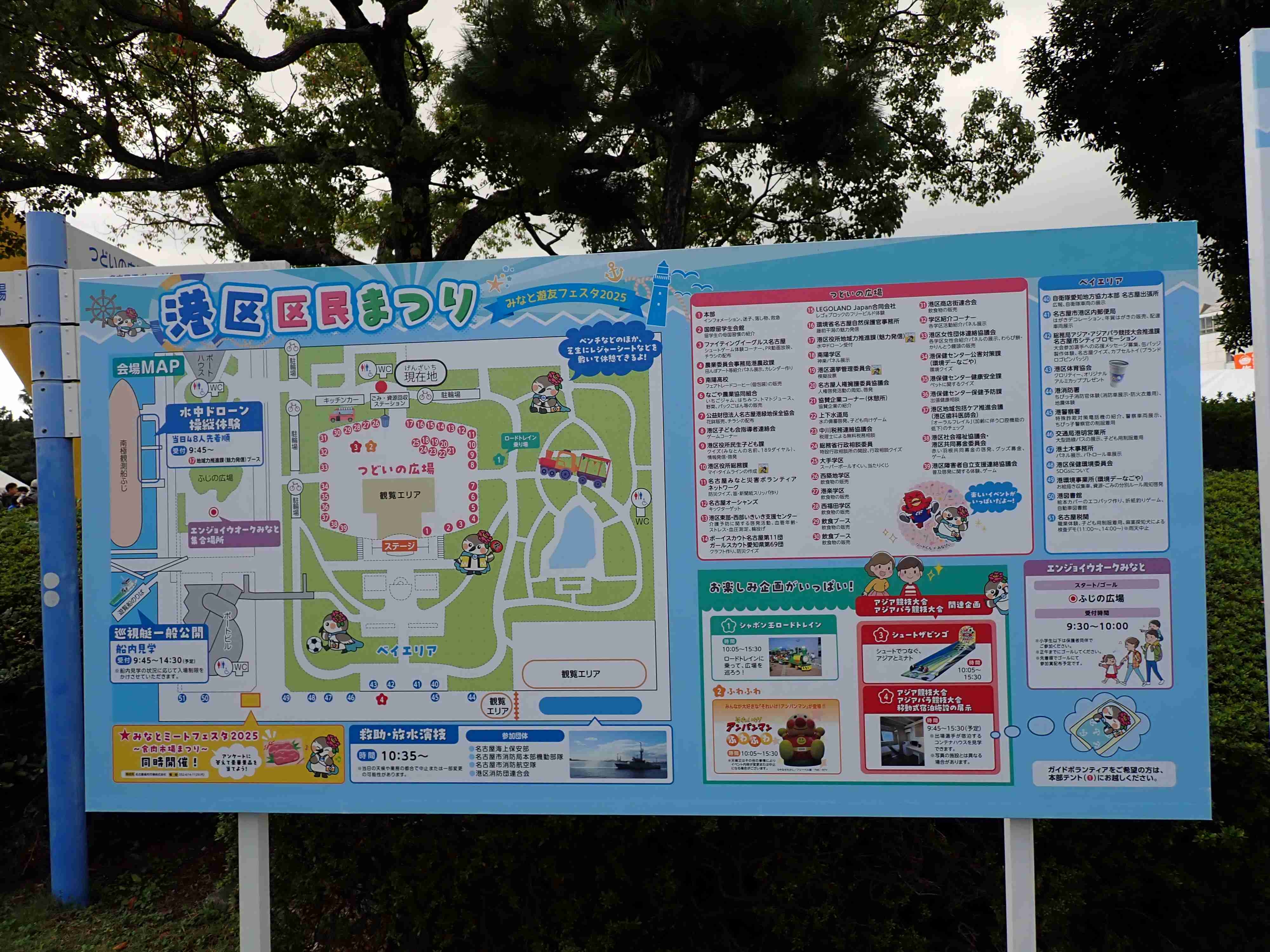 今回は、私たち名古屋自然保護官事務所がある愛知県名古屋市港区が毎年開催している港区の区民祭り「みなと遊友フェスタ2025」に出展のため、港区のガーデンふ頭にある「臨港緑園つどいの広場」に行ってまいりました。広い公園の広場に港区に関係する行政機関や小学校等の学区の皆さま、またそれだけではなく、民間の方々も多く参加される港区随一のイベントです。