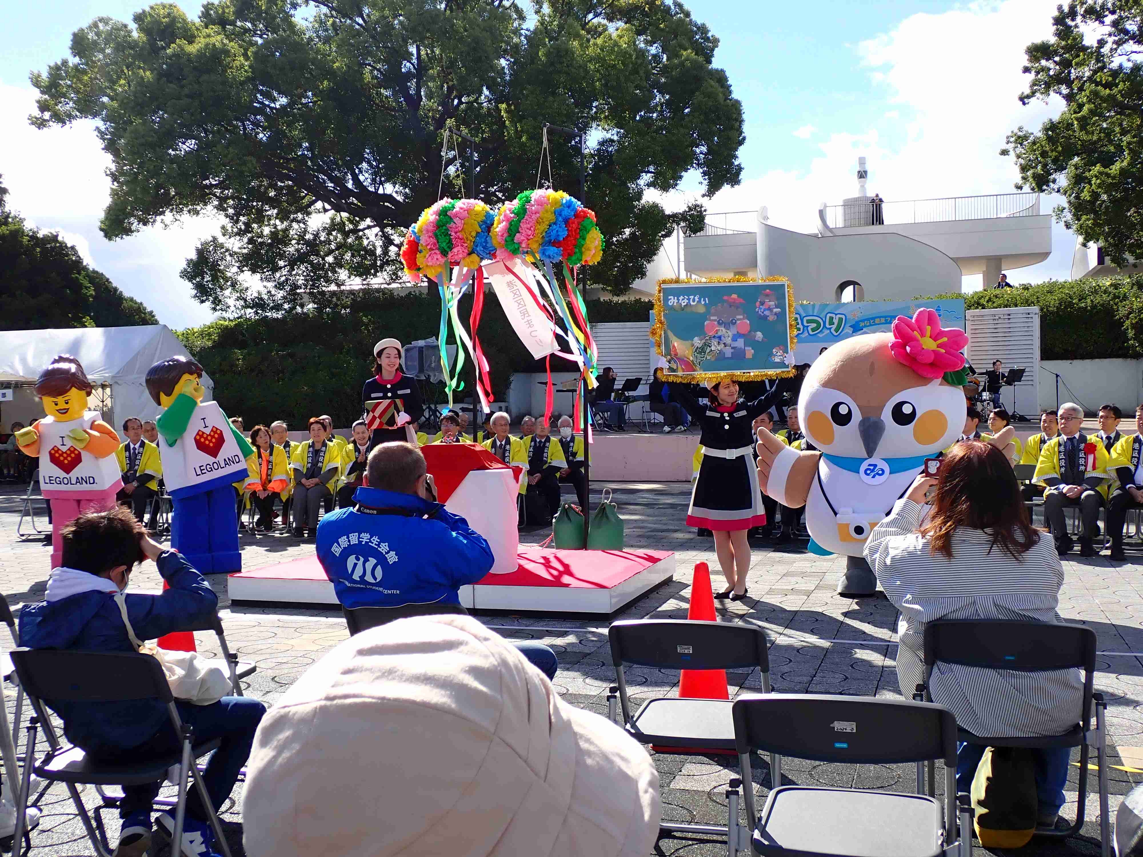 バタバタでの準備でしたが、準備が終わるころには青空も見え始め、オープニングセレモニーに併せて無事区民祭りが始まりました。写真右側に見える鳥の着ぐるみが港区のマスコット「みなぴぃ(ハマシギの妖精)」です。