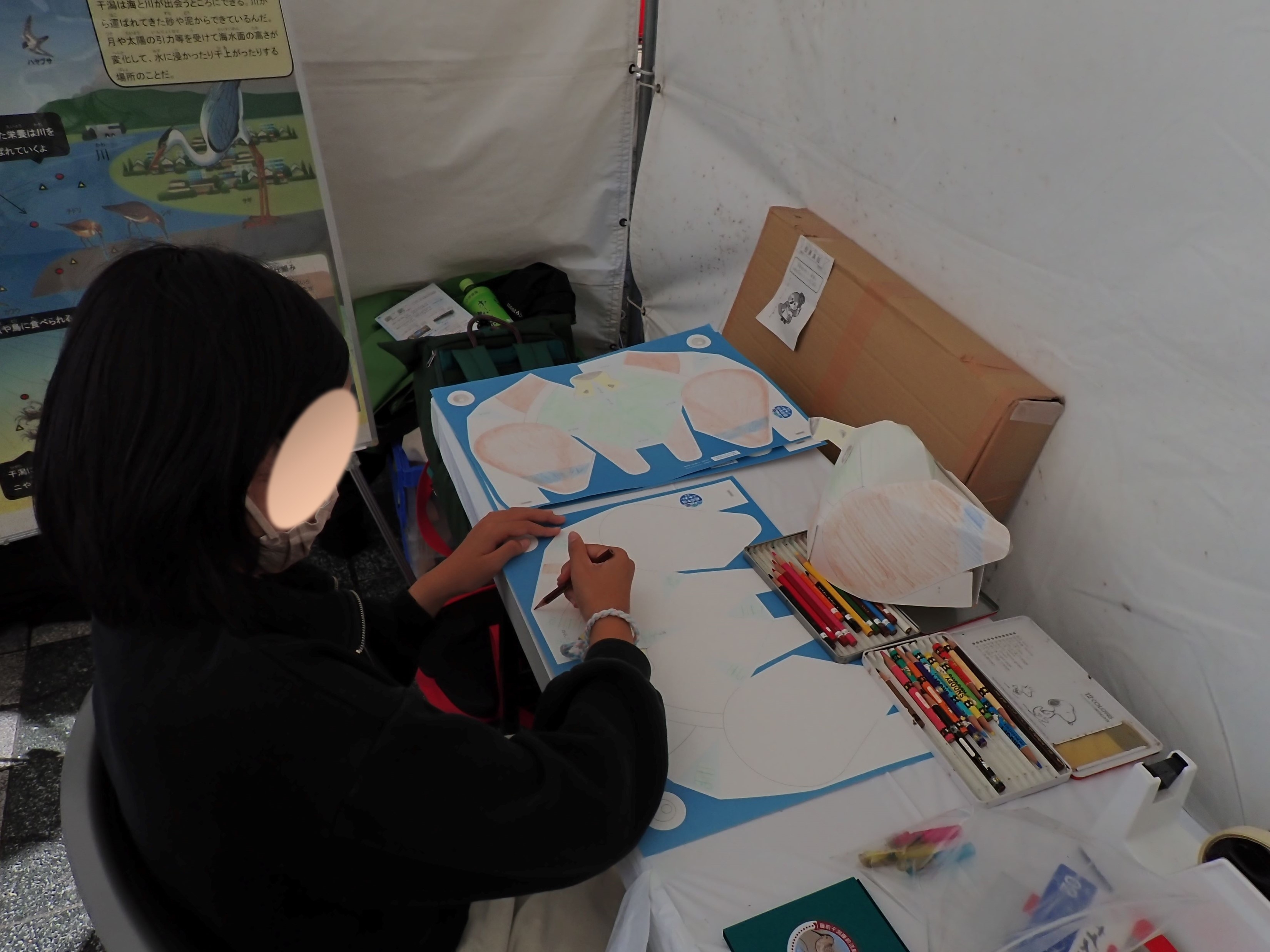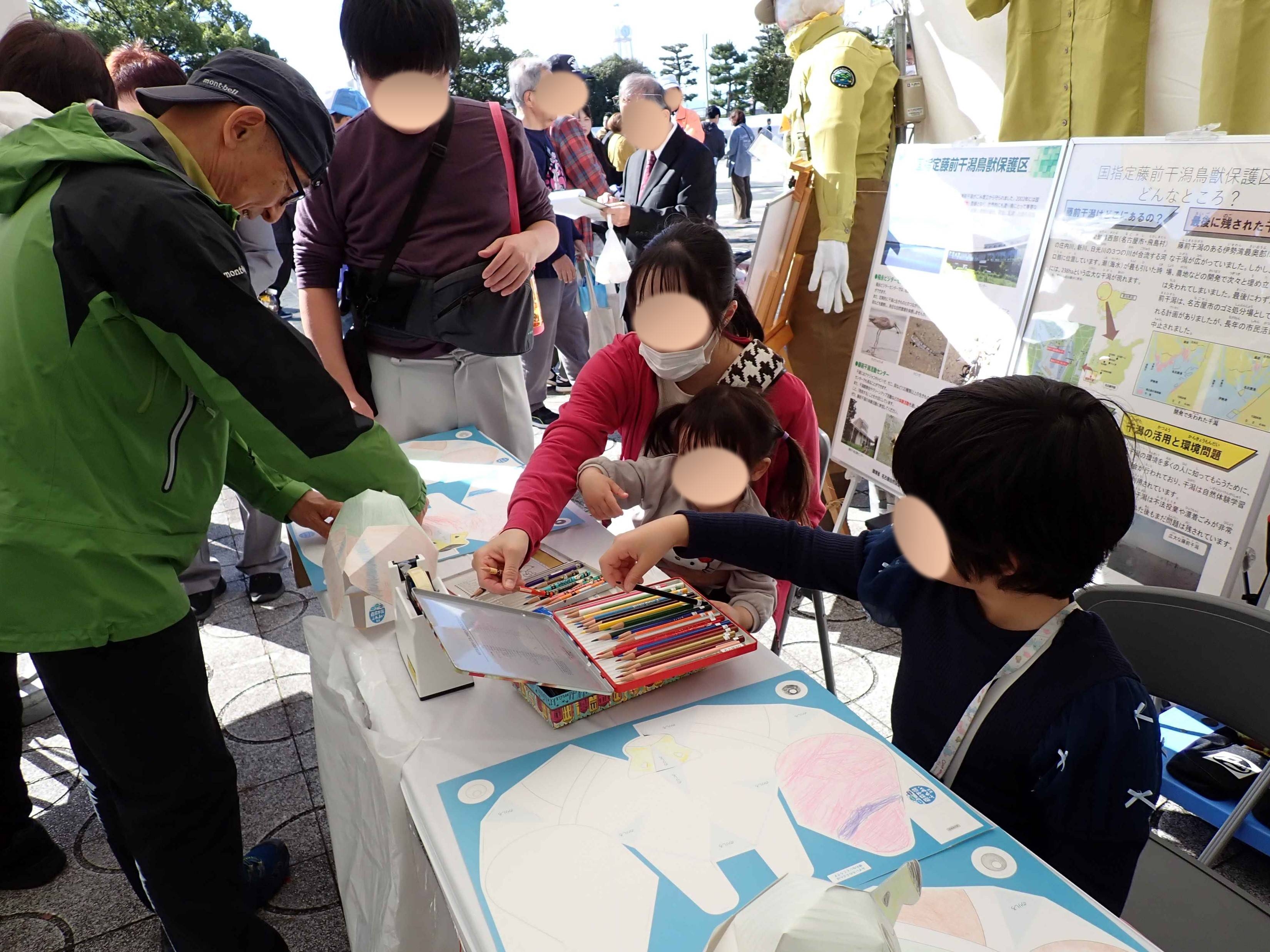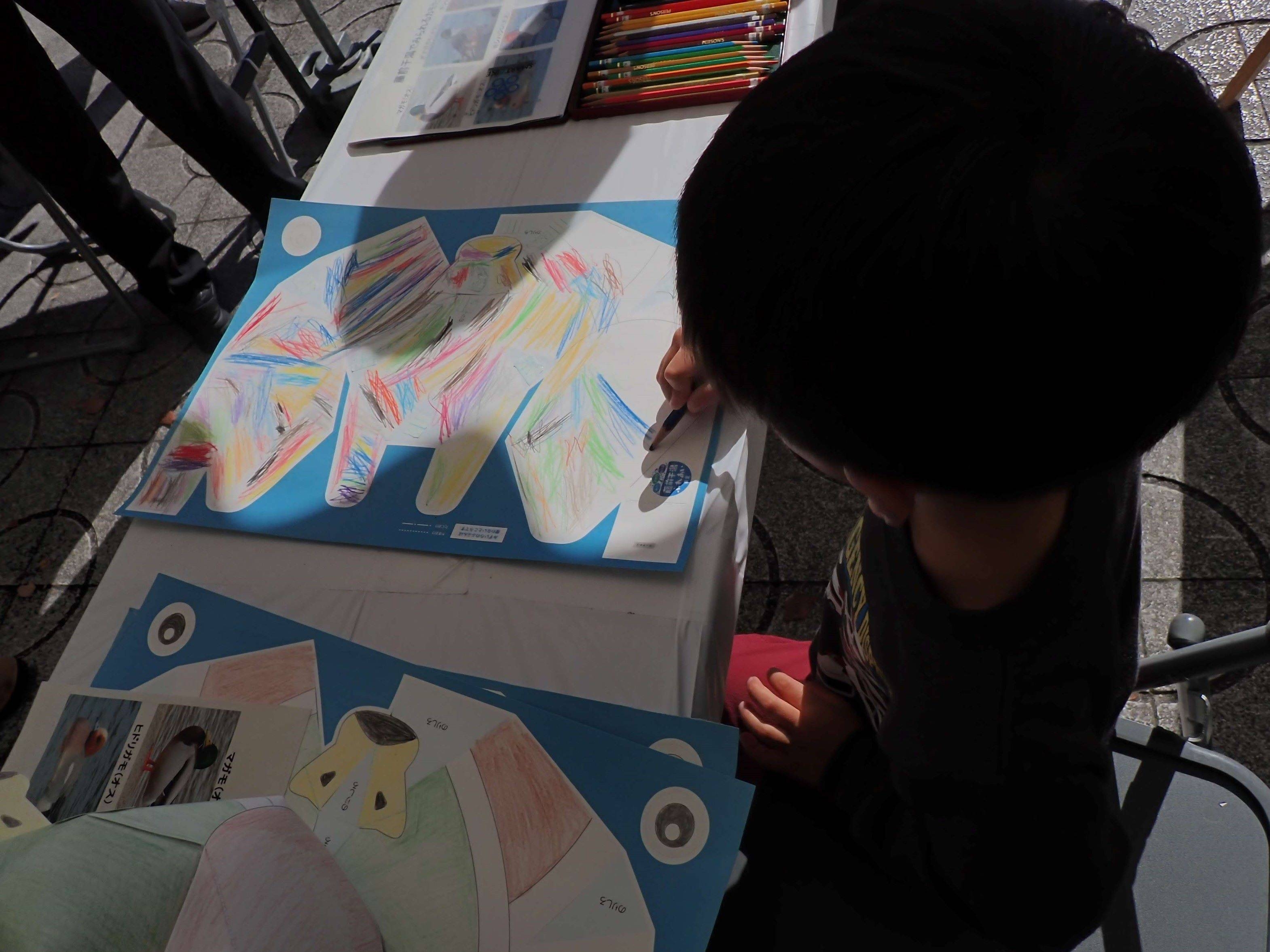 こちらはというと、本日はレンジャー君をアイキャッチにして普及啓発を兼ねたワークショップを開催しました。ワークショップの内容は「カモのペーパーキャップ作り」で型紙に参加者が思い思いにぬり絵をしてオリジナルカラーのカモのペーパーキャップを作ってもらうワークショップです。