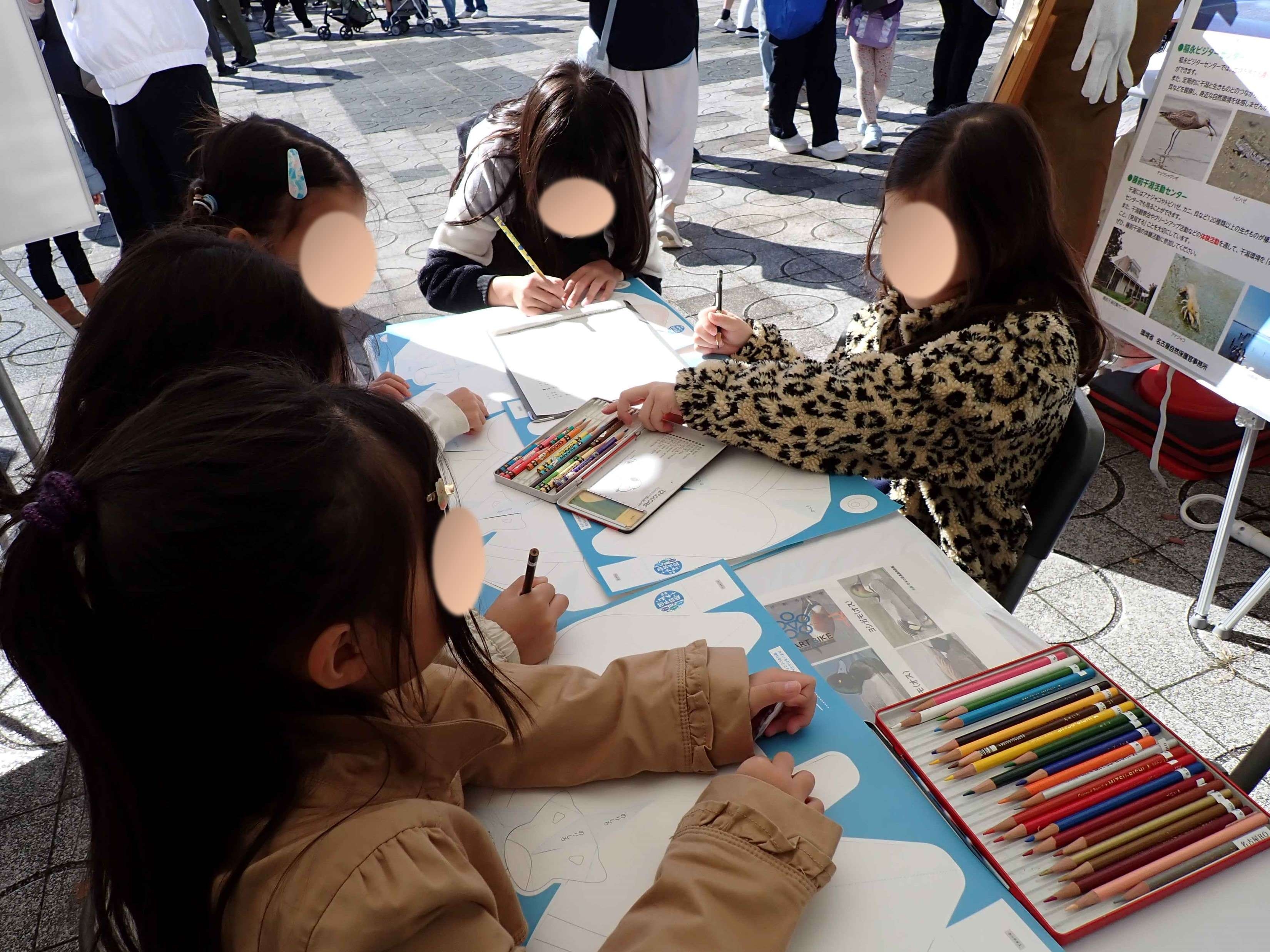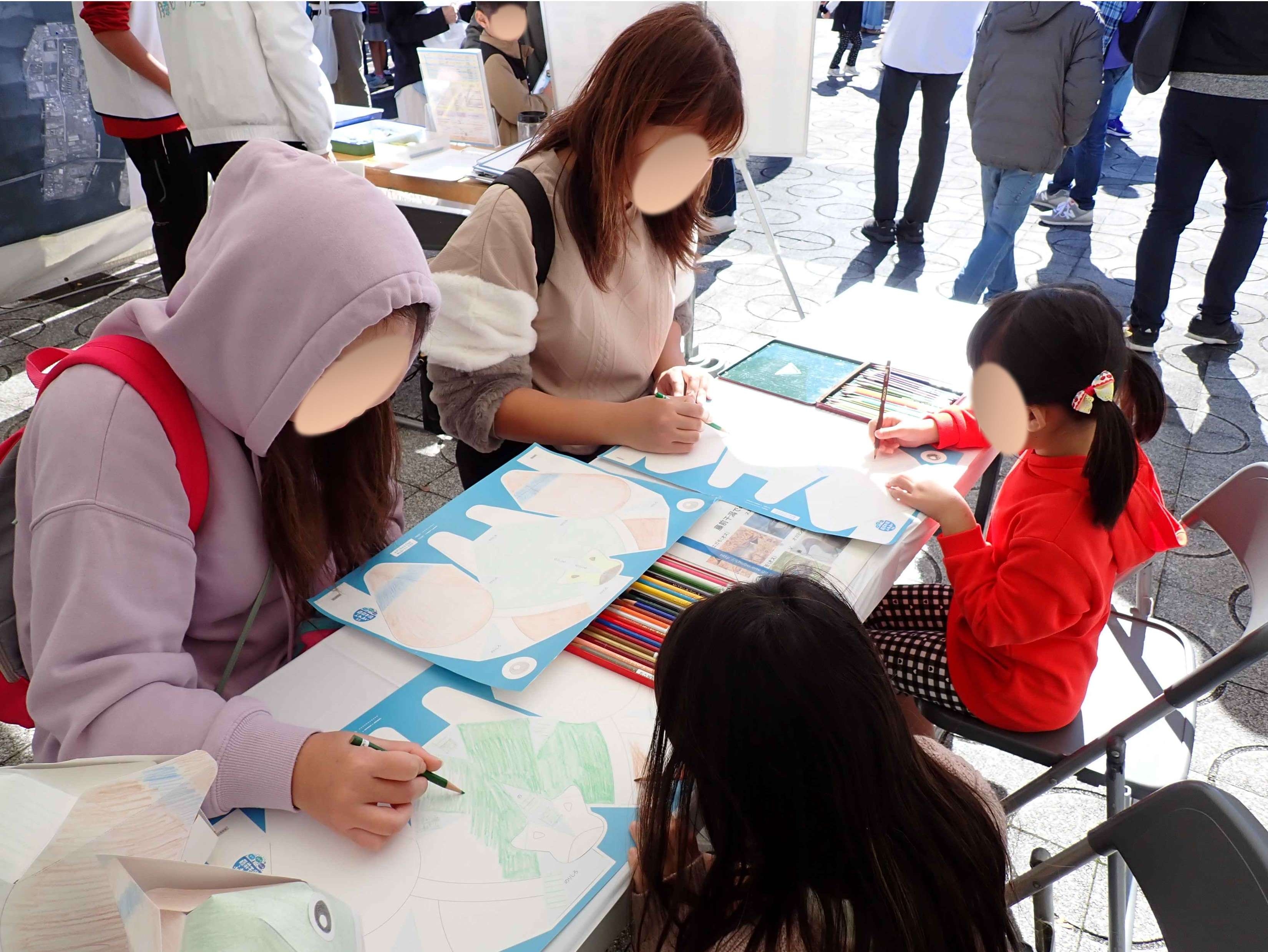 私たちのブースはというと開催後1時間ほどは、お客様もまばらでブースの前を通る皆さんに普及啓発を行っていたのですが、少し落ち着いた10時過ぎからお子様たちがぽつりぽつりとワークショップ、そうカモのペーパーキャップ作りに来てくれました。ペーパーキャップの台紙に色を塗るのがみなさん楽しいようです。