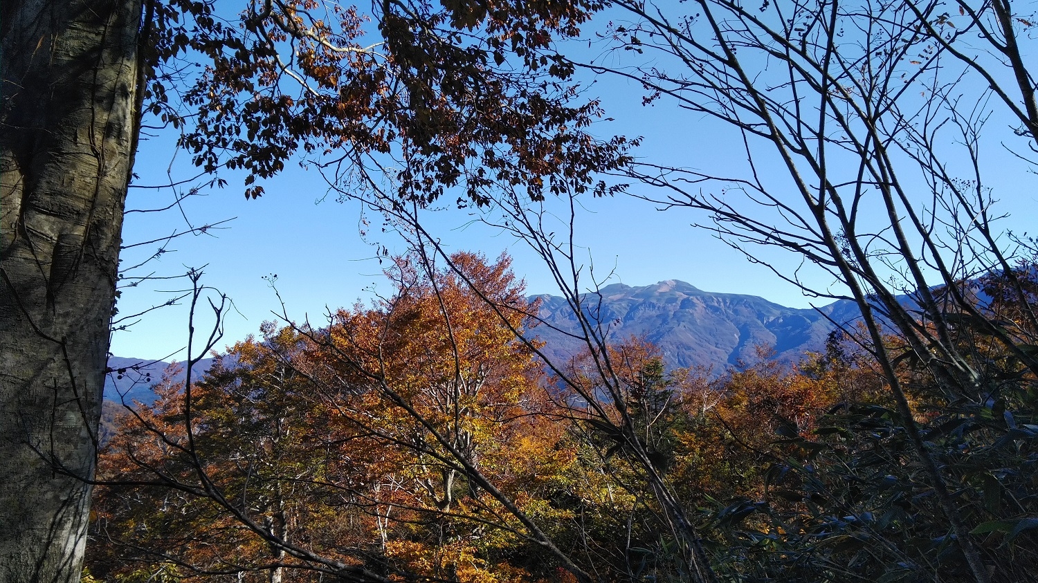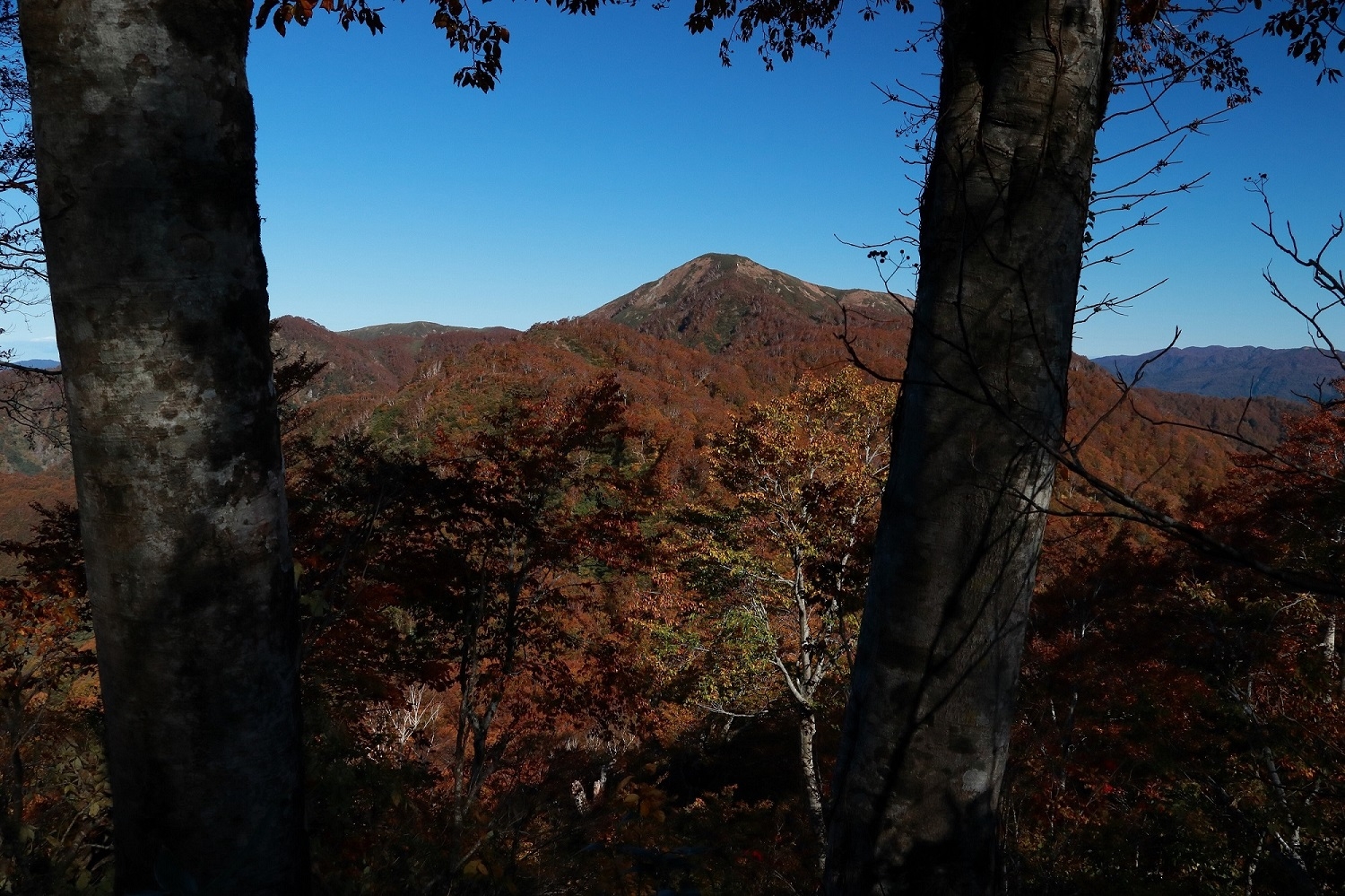 | 振り返ればブナの幹の額縁の中に大長山 |