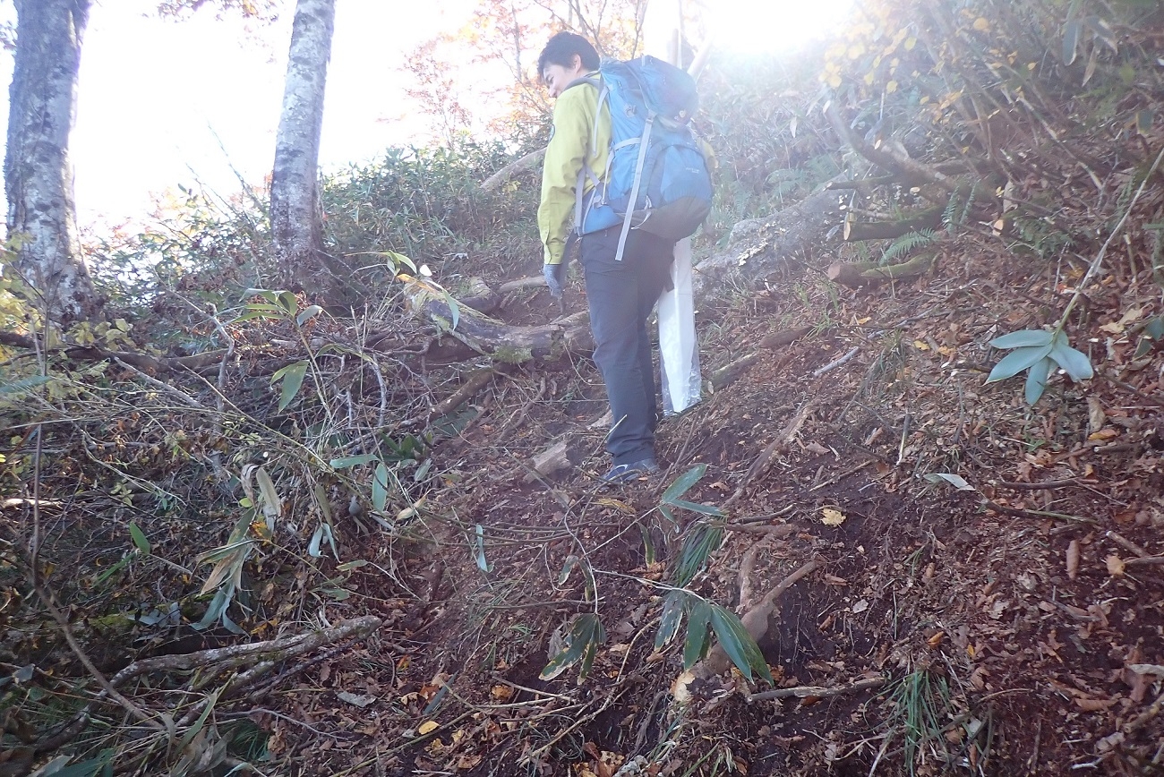 | この日の作業道具を担ぎ&手に持ち、足下に気をつけながら登る染谷保護官 |