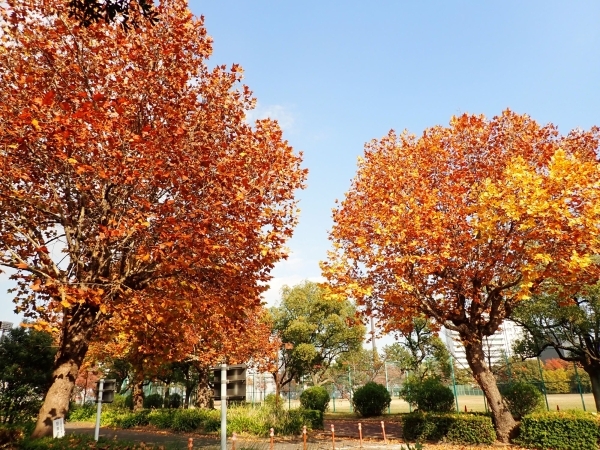 私たちの事務所に隣接する稲永公園の木々の赤や黄色に色づいた葉も、