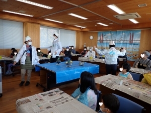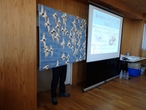 まず、デコイを使って藤前干潟に鳥たちが集まる様子を寸劇で紹介しました。