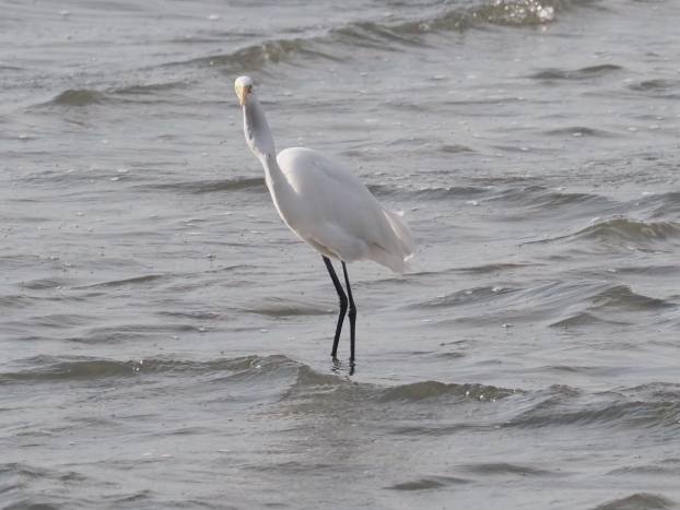 そんな干潟でも、ダイサギは長い脚ですくっと立ち、身をかがめて首を伸ばし、