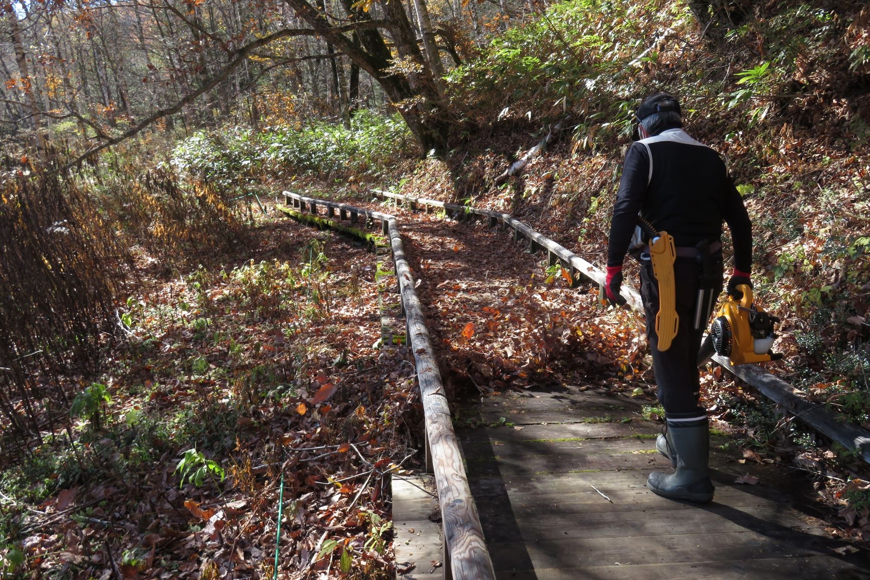 降り積もる落ち葉をそのまま放置しておくと湿気が溜まって木道が傷んでしまうため、歩きやすさのため以外にも、箒やブロワーを使って清掃を行います。