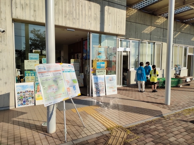 <藤前干潟活動センター 会場図やバスの時間帯を知らせる看板も。賑やかな玄関です>