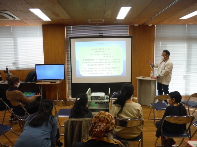 (株)水圏科学コンサルタント・東京海洋大学共同研究員の大村卓朗氏を講師にお招きし、干潟とプランクトンの関係や、プランクトンって何?といった基本的なお話、標本の観察など、1時間半とは思えない盛りだくさんの内容でした。