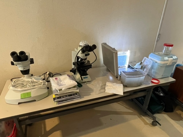 <プランクトン講座の準備 これらの顕微鏡やサンプルは事前に先生が準備して郵送してくれていました!>