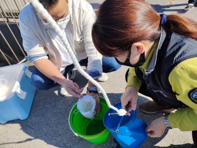 <プランクトン講座の準備 大村先生と白山ROの森さん プランクトンを採取しています。いろんな方に声をかけられていました!>