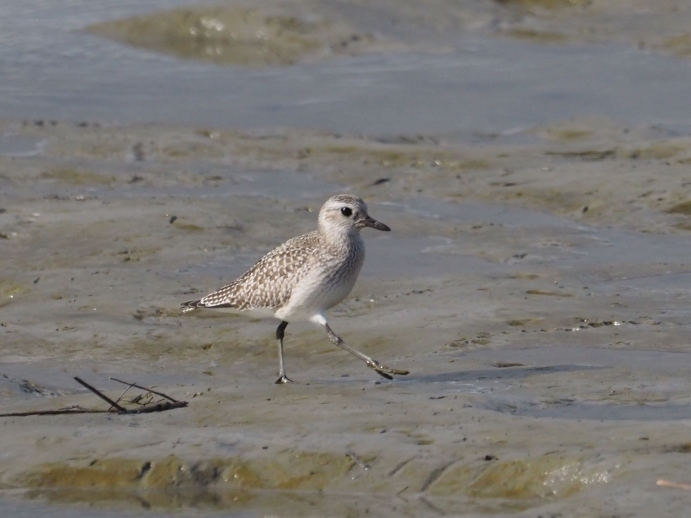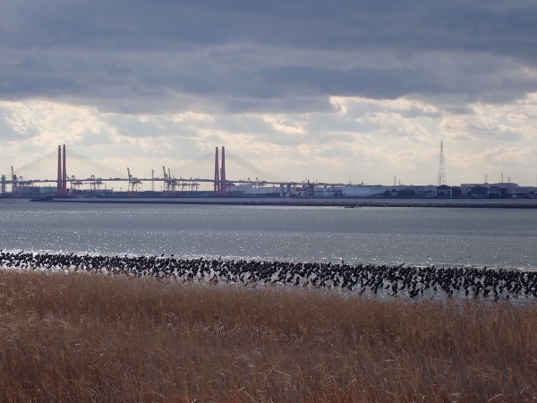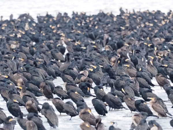 12月のある日、干潟に向かって堤防を歩いていたら、干潟がカワウで埋め尽くされていました。