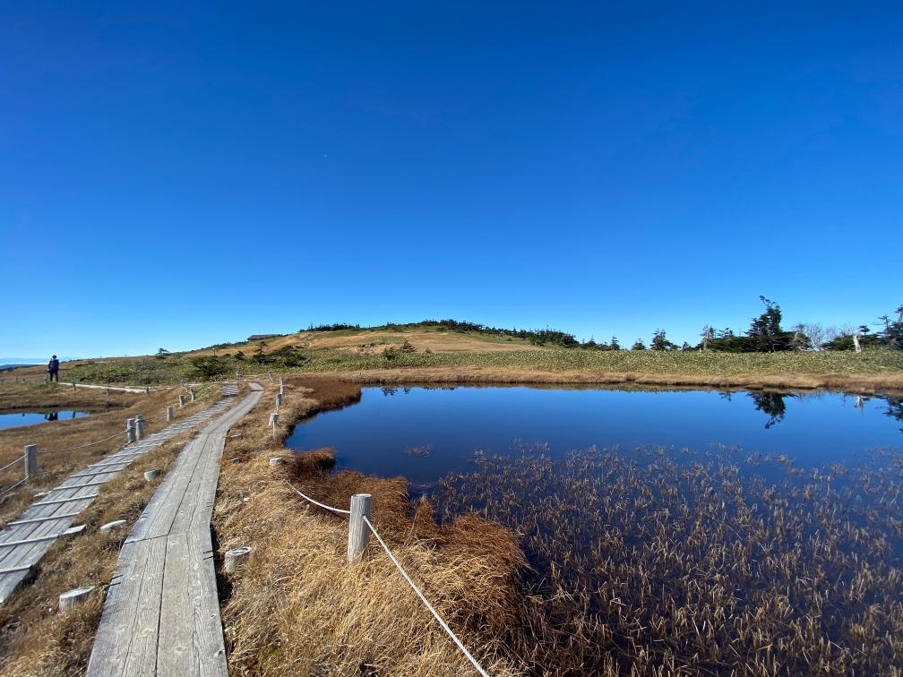 秋の山頂湿原の風景で、気温が低く大気の揺らぎも少ないため青空がより鮮明に見えました。所々にある池塘は青空を反射し、まるで空の中を歩いているような感覚がしました。