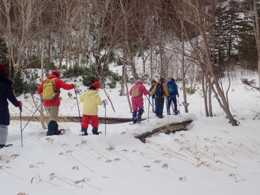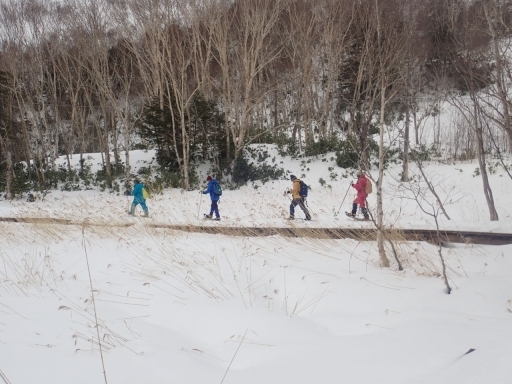 今年は積雪が少なく集合場所から牛池の方に下るときは斜度があるのでみなさん横向きでそろそろと下っていました。