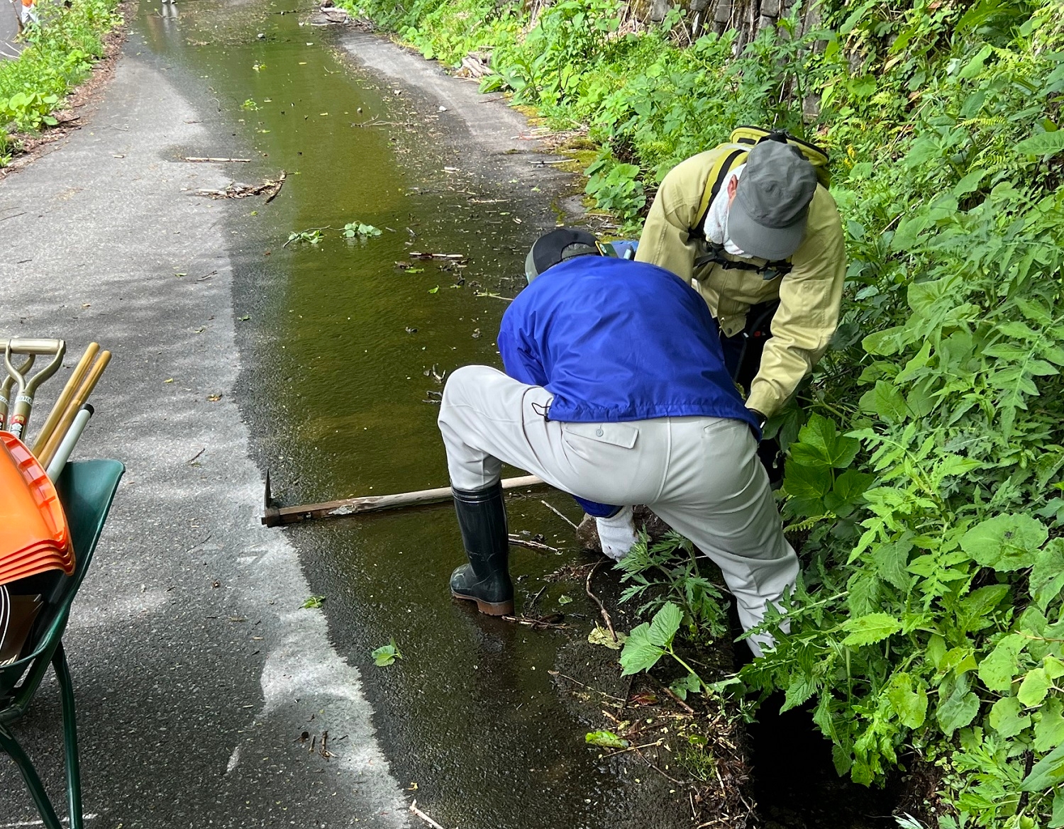 (側溝掃除は力だけでなく連携も重要!)