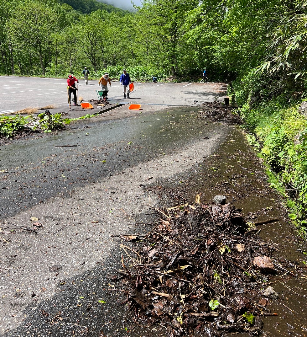 冬期通行止めでアクセスできなかった別当出合駐車場には、落ち葉や枯れ枝が散乱し、側溝には雨や雪解け水によって流された土砂などが溜まっています。放置すると雨が降るたびに水があふれて駐車場が水浸しになり、落ち葉や土砂が広がってしまうので、毎年掃除をしています。