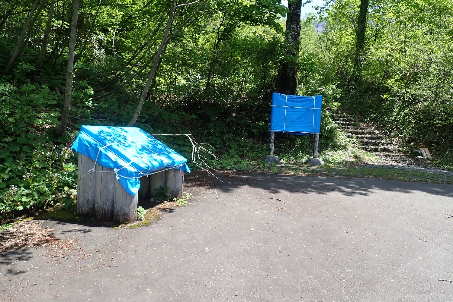 別当出合には登山道などを案内する看板が数基ありますが、それらは積雪によって表面が削られるのを防ぐため、冬の間はブルーシートで覆って保護しています。