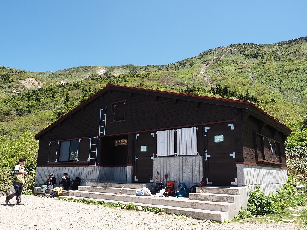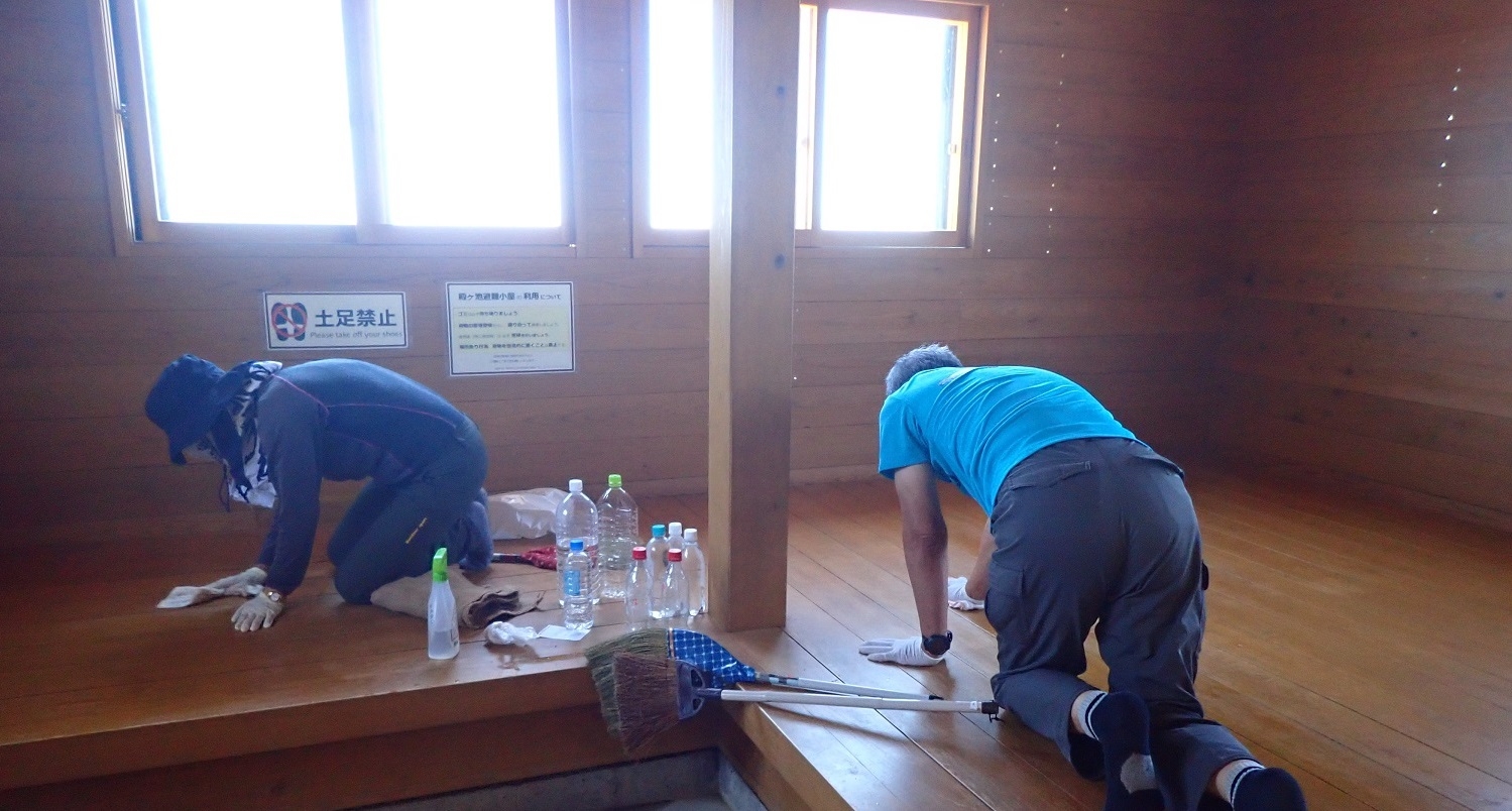 冬の間の汚れをはらい、開山後に登山者の皆さんに気持ちよく休憩等で利用していただくため、環境省が管理している甚之助避難小屋と殿ヶ池避難小屋の清掃を行っています。
