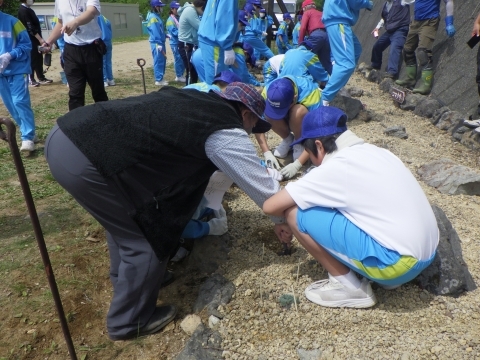 地元の中学生と一緒にコマクサ苗を植栽をする様子