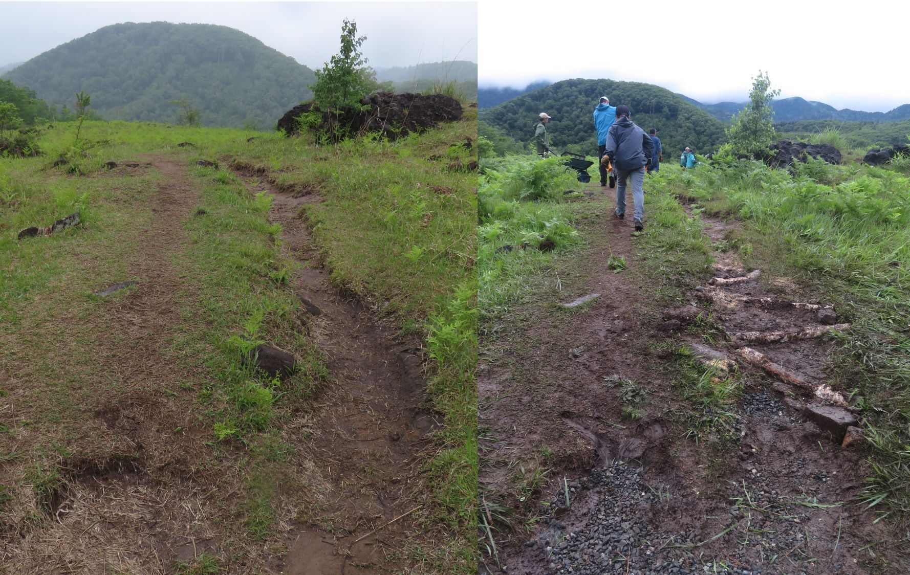 作業した場所は、乗鞍高原一の瀬のビュースポットである「まいめの池」に至る散策路です。この道は人の往来で出来た踏み跡に、雨のたびに水が流れることで、ガリー(谷)状に洗堀されて歩きづらくなっていました。二日間とも雨(というより暴風雨……)だったため、実際に水の流れを観察し、何が原因で道が削られてしまったのかを皆で考えながら、一の瀬で出た伐採材や石、土砂など現場で手に入る資材を使って階段工を整備しました。
