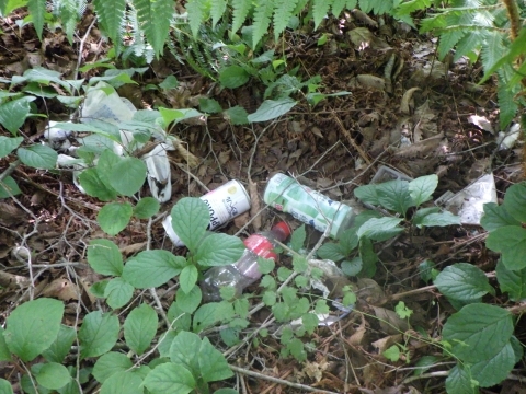 (左)茂みの中に捨てられた缶やペットボトル、(右)集めたゴミ