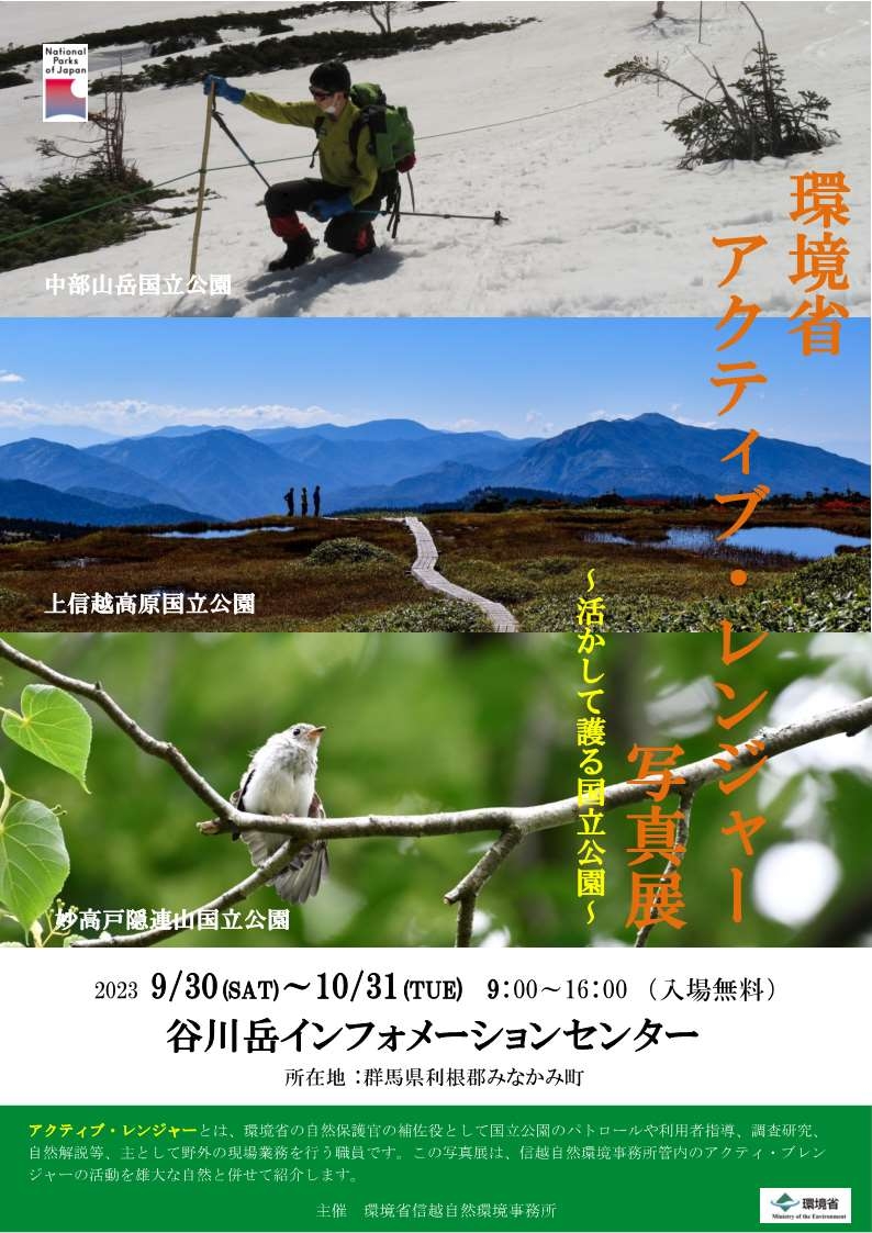 今年度は、「環境省アクティブ・レンジャー写真展~活かして護る国立公園」と題して、上信越高原国立公園、妙高戸隠連山国立公園、中部山岳国立公園の3公園のアクティブ・レンジャーなどが撮影した、活動の様子や国立公園の景色などを展示いたします。