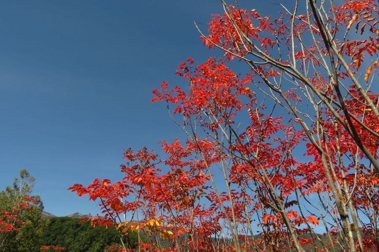 この冷え込みで気になることといえば、やはり紅葉ですよね。乗鞍高原・一の瀬園地では、草木が徐々に色付き始めてきました。最も早いのはウルシで、すでに園地の至るところで真っ赤に染まっている姿を見る事が出来ます。