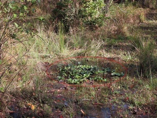 (赤丸が湿地に侵入した外来種のホテイアオイ)