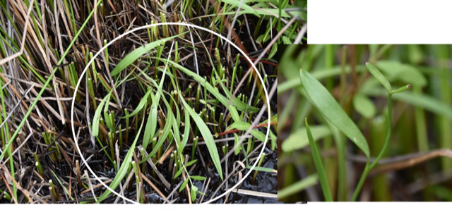 草高1.5mほどのアンペライの株元から貧弱な葉だけを出しているトキソウ(白枠内の細長い葉)。