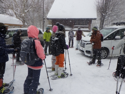 万座しぜん情報館で受付をした後、集合してスノーシューつけたら出発です。